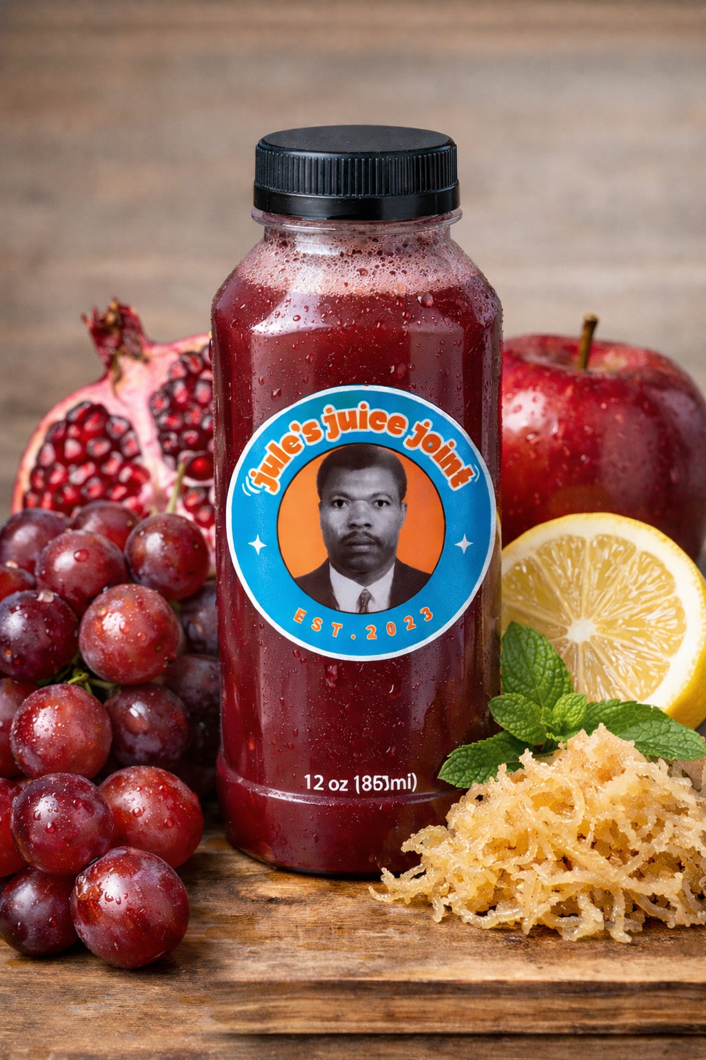 A 12 oz all-natural cold-pressed juice made with pomegranate, red grapes, red delicious apples, lemon, mint & sea moss
